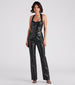 Show off a major slay in these sleek and edgy faux leather pants! They feature a high-rise waist with a button-front closure. front pockets. a hip-hugging fit. and a wide-leg silhouette. The smooth faux leather fabric gives off a chic sheen. Complete the look with the matching cropped vest and strappy stiletto heels.