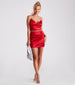 You'll look totally luxe in this silky-chic satin mini skirt! It features a high-rise waist. front ruched detailing. a mini-length hem. and a curve-hugging silhouette. The smooth satin-knit fabric offers a moderate stretch. Style with the matching crop top and a rhinestone handbag.