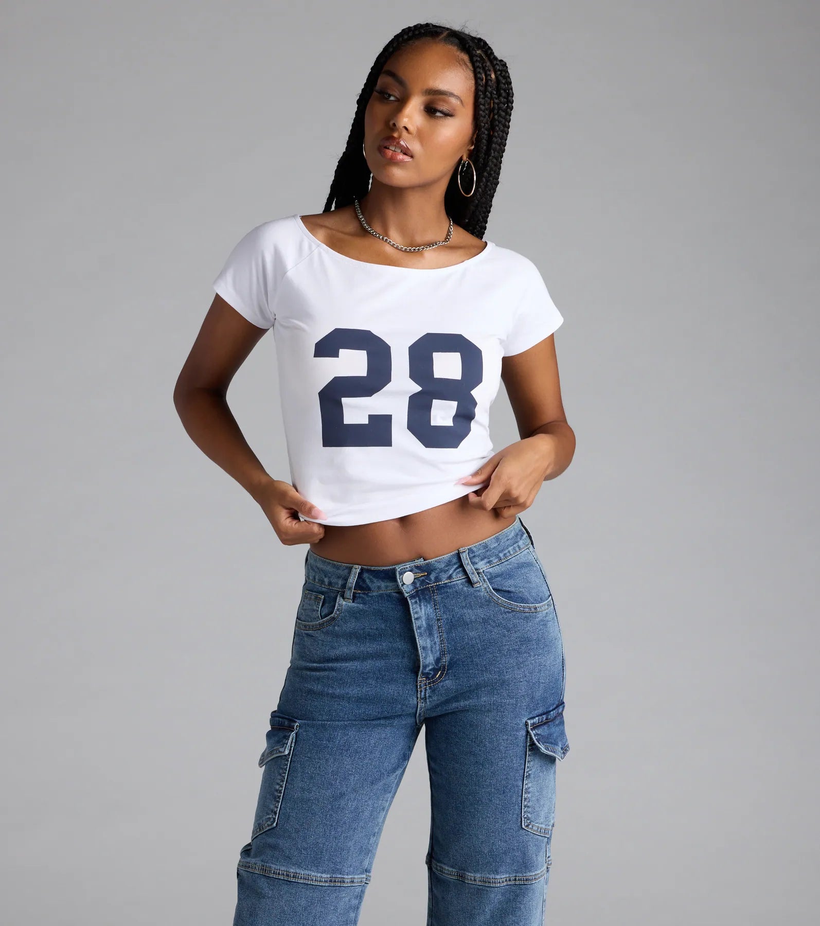 Effortlessly cool and essential. this graphic tee features a "28" graphic across the front on soft knit stretchy fabric. Pair with denim for a vibe!