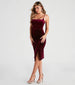 Make your entrance in this velvet midi dress designed to stun! It features a sleeveless square neck. spaghetti straps. fitted bodice with side pleats leading to the form-hugging asymmetrical wrap hem. Complete your dreamy look with a chic clutch and heels.