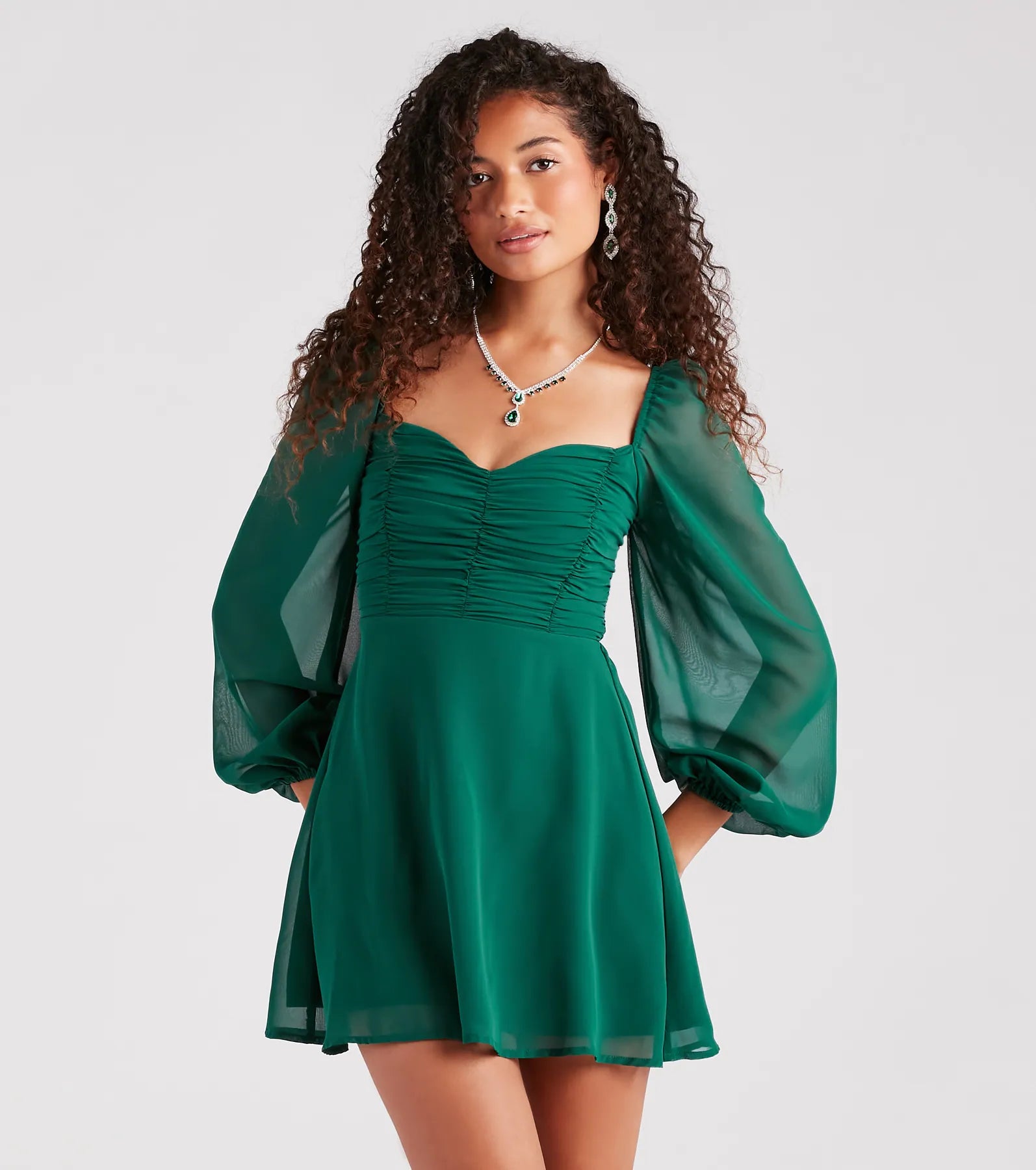 Slip into something a little more romantic with this chiffon skater dress! With sheer peasant long sleeves. a sweetheart neckline. and a smocked back. this frock will ensure that your evening style is truly swoon-worthy. Its ruched bodice. skater silhouette. and short-length hem make it a must-have for any date night when you pair it with a necklace and heels!