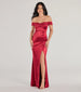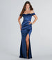 A luxurious choice. the Albi formal long dress showcases sophisticated details from its lustrous satin fabric to her flattering pleated off-the-shoulder neckline and side pleated seam. With a high front wrap slit and an eye-catching mermaid silhouette that cascades to a floor-length hem. this long dress exudes premium elegance. The formal dress is composed of a silky satin fabric with a sheen effect and minimal stretch. Complete the look with statement earrings for a black tie party or celebration!