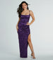 Dare to sparkle in the Alessia sequin satin formal dress at galas. prom. and fancy parties! Exquisitely crafted with countless sequins in a scroll pattern on luxurious satin fabric. this formal gown brings an enchanting presence. A sleeveless square neckline and adjustable spaghetti straps give you a flattering look. while the underbust seam creates an enhanced bust. Shine in the slim silhouette as the high side slit and long-length hem add a touch of elegance to your evening. Complete the look with a clutch and bracelets for a memorable evening out!