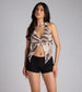 Command attention in this striking halter crop top featuring a flattering twisted neckline. a daring split design. and a cropped length that perfectly highlights your figure.