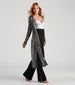 The more glitz and glam. the better! This sequin duster is perf for the holiday season. It features long fitted sleeves. an open front. a long. flowy. relaxed silhouette with side slit accents. and all-over sequin embroidery for the prettiest shine. The lined knit fabric has minimal stretch. Layer over a bodycon dress for a holiday party.