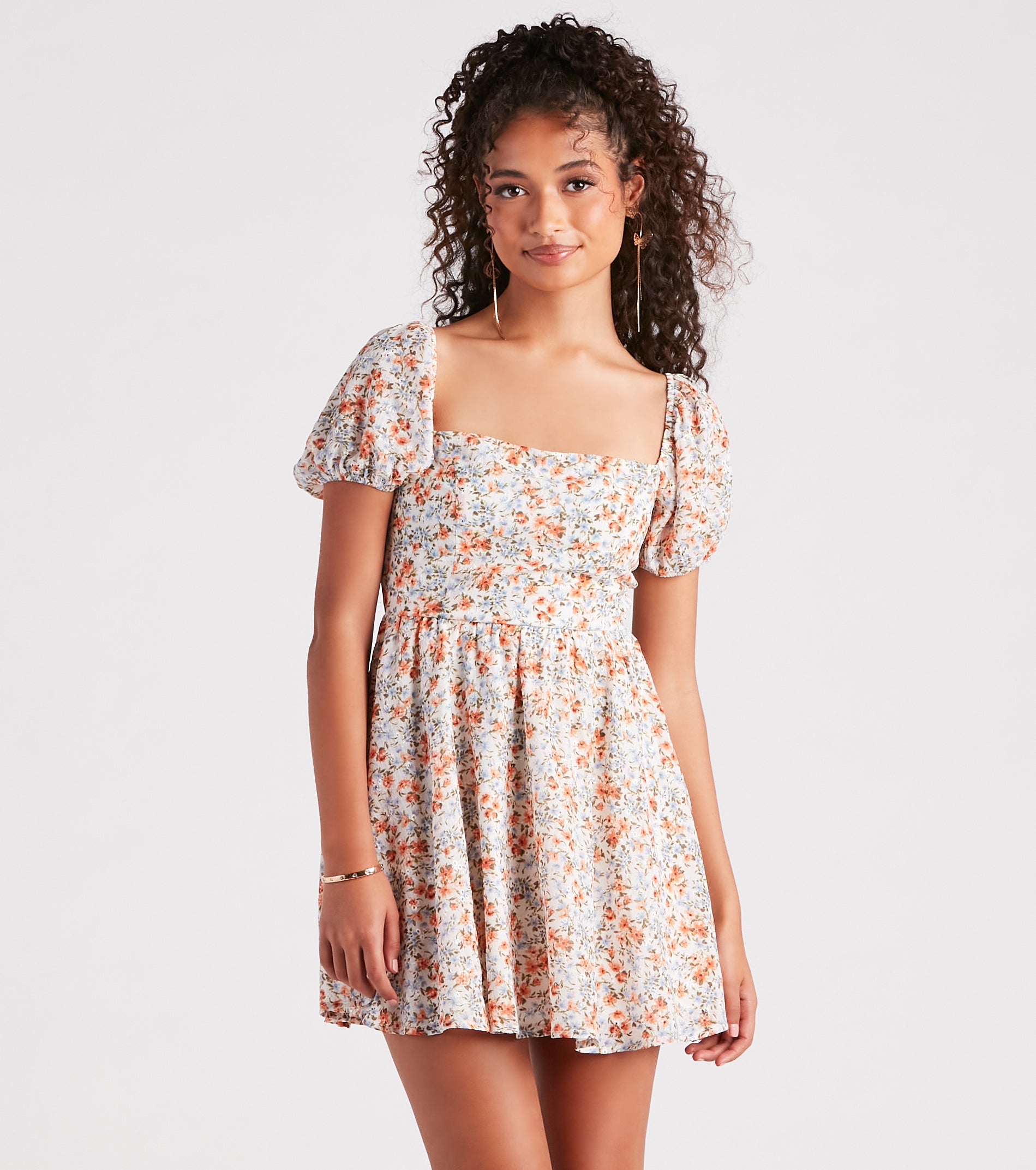 Always charming and cute. this floral eyelet lace dress boasts adorable allure! It features puff short sleeves. a square neck. a tie-back design. and a flattering skater silhouette and short-length hem. Complete the look in strappy sandals for a baby shower or family party.