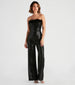 Chic and alluring. you'll always look fab in this feather-trim sequin jumpsuit! It features a strapless neckline with a marabou feather trim. a fitted bodice and waist. a wide-leg silhouette. and all-over sequin embroidery so you can shimmer and glimmer all night long! Style with rhinestone statement earrings and stiletto heels.