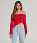 Live the glam life in this off-the-shoulder asymmetrical crop top with a chic foldover accent and cozy long sleeves on rib knit fabric. Complete the look with high-rise bottoms.