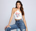 Get a fab summertime look with this Americana crop top! It features a sleeveless halter neckline. spaghetti straps that lead to an open back with a cross-back tie design. a cropped fit. and a center eagle and flag graphic with the script "American US Tour. Wild And Free." Style this top with cutoff denim shorts and sneakers.