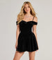 Elevate your formal outfit in a luxe velvet short dress featuring an off-the-shoulder collared sweetheart neckline. adjustable spaghetti straps. a drop-waist design. and a pleated skater silhouette. Complete the outfit with glitter mesh heels.