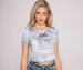 Rep that sweet energy with a graphic top that says it all! The top features a crew neckline with a mini V-shaped notch accent. short sleeves. a graphic that reads: "Angel Energy". and a cropped hem. The top is composed of a ribbed knit fabric that offers a relaxed fit with a moderate stretch. Complete look with cutoff shorts.