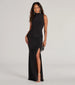 Capture sophistication in the Angela floor-length formal dress at galas and weddings. The formal dress is designed with a sleek mock neckline. a high front slit to show some skin and a mermaid silhouette that flaunts your figure.