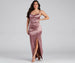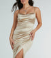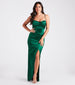Wrap yourself in the sleek and stunning Annabelle knit satin formal dress for effortless glamour! She features a sleeveless cowl neckline with a padded bust. adjustable spaghetti straps for a customized fit. front ruching at the waist. and a floor-length. wrap-front skirt with a fitted A-line silhouette. Style this long dress with sparkling rhinestone earrings.