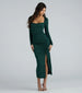 The April formal glitter midi dress is a statement piece for any special occasion. Crafted from a glitter knit fabric. she features a cowl neckline. fitted long sleeves. bodycon silhouette. and a front ruched seam and slit that will flatter any figure along her midi-length hem. The formal dress is crafted from a glitter knit stretchy fabric ensuring you'll radiate sparkle all night long! Complete the look for a banquet or wedding with rhinestone heels.