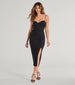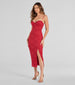 Bring the glamour in a glitter floral lace dress features a sleeveless sweetheart neckline. a corset bodice with molded cups. adjustable spaghetti straps. a high side slit. and a midi-length hem. Complete the formal outfit with a rhinestone clutch.