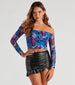 Showcase your artistic soul in this mesh crop top for a night out downtown! The top features an off-the-shoulder neckline with fitted long sleeves and front keyhole cutouts with glam rhinestone buttons. Complete the look in a flirty faux leather skort.