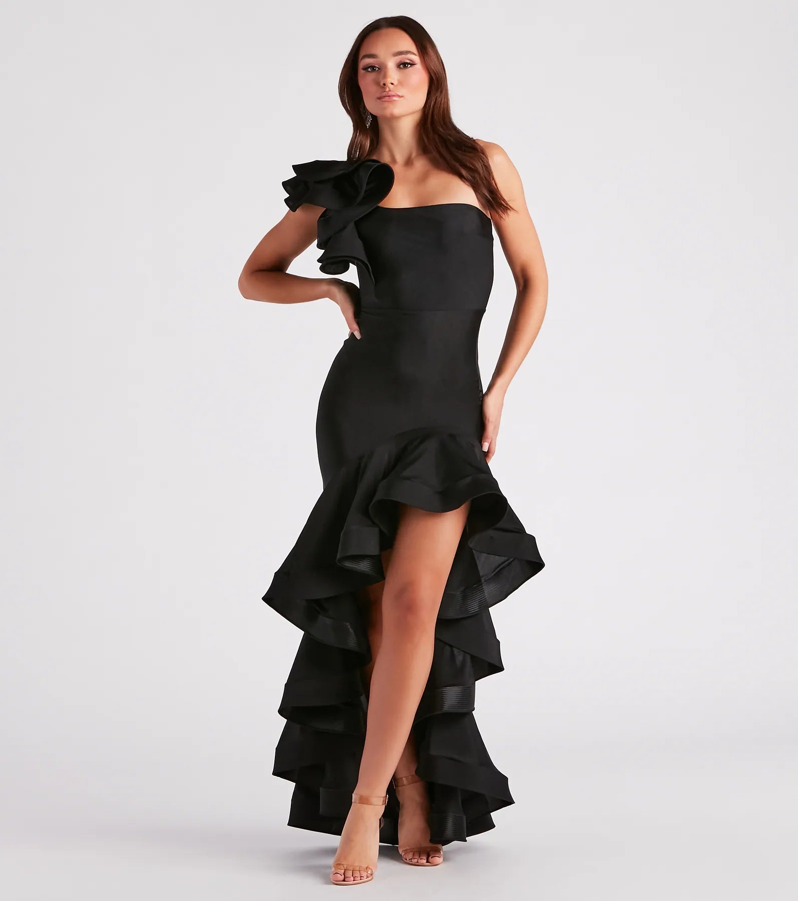 Timeless with an eye-catching twist. the Audrey long formal dress is ready to make your acquaintance for banquets. ceremonies. and black-tie events. She features a striking sleeveless one-shoulder neckline. a bonded ruffled design for a structured look. a flattering mermaid silhouette. and a bonded ruffled long-length hem. The formal dress is composed of a sleek scuba knit fabric with plenty of stretch. Complete the look with a clutch and stiletto pumps.