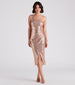 Get some compliments when you stun in the Ava formal sequin dress for upcoming cocktail mixers or art show galas! She radiates shine and a classic style in her sleeveless. one-shoulder neckline. tank-style strap. high-waist seam. and form-hugging asymmetrical wrap slit midi-length hem. The formal dress is composed of a sequin patterned fabric with a sewn-in knit lining and moderate stretch. Style with sleek block heels to complete the look!