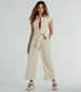 Soar into this utility jumpsuit to take your style to new heights! Perfect for casual outings or travel. this twill-woven jumpsuit offers style and functionality with trendy cap sleeves. a collar neckline. button-down front closures. an adjustable tie-waist belt to snatch your figure. convenient front pockets to keep your things handy. and a flattering wide-leg silhouette. Complete the look in platform sneakers.