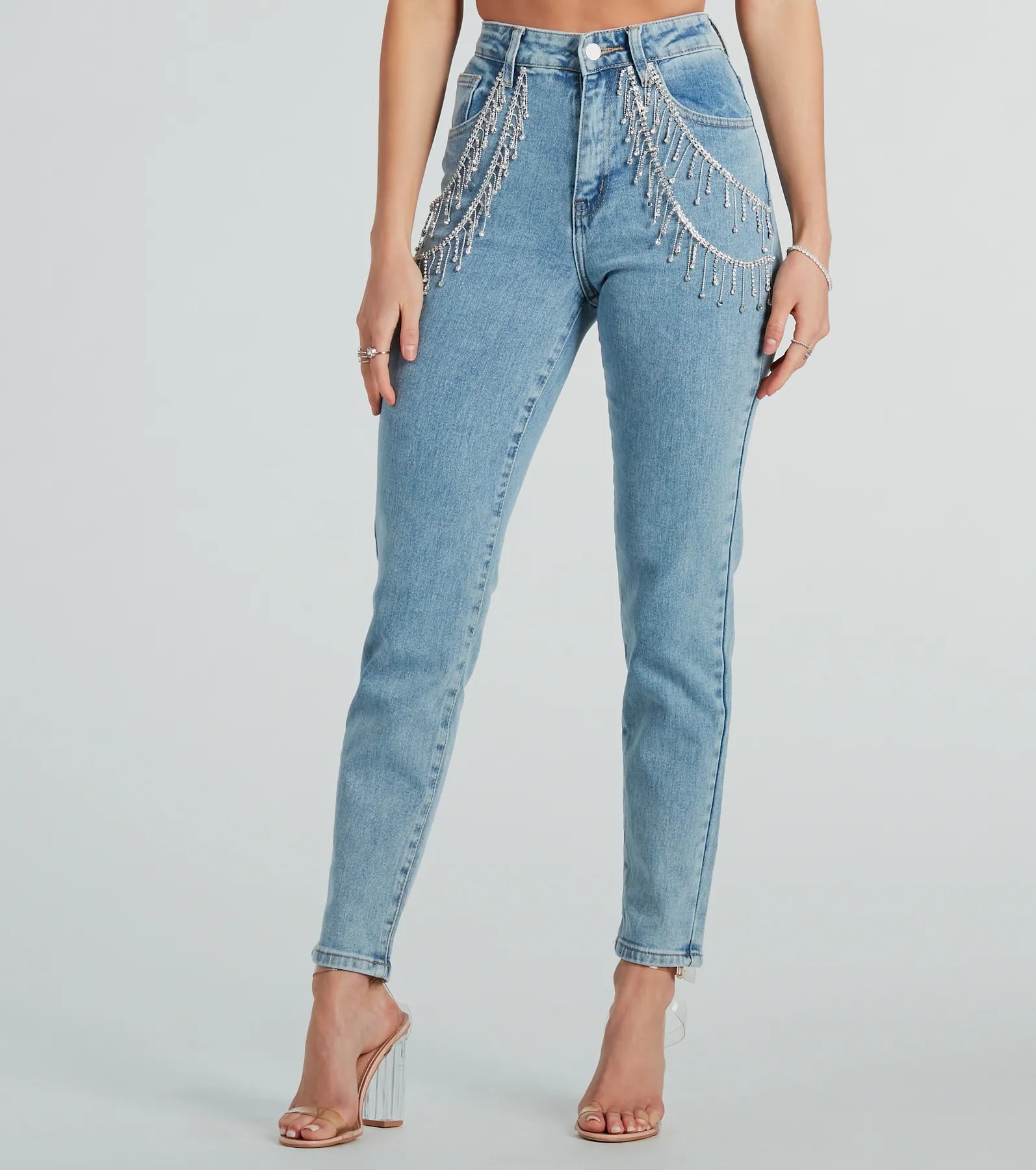 Upgrade your look in these sparkly denim jeans showcasing major bling! They feature a flattering high-rise waist. rhinestone fringe pocket detailing for a glam style. and a skinny-leg silhouette on medium-wash denim fabric. Complete the look in a glitzy bustier for an NYE party or a night on the town!