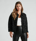 Pick up the phone cause this rhinestone denim jacket wants to be yours! It features a trendy oversized silhouette. long sleeves. a collared neckline. flap pockets. a button-down front. and all-over rhinestone embellishments. Complete the look in sleek leather leggings for an evening out!