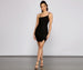 Showcase bold looks and give off a major bombshell vibe in this mini dress! It features an asymmetrical neckline with adjustable spaghetti straps. a mini length. curve-hugging silhouette. and a front slit. Pair this little black dress with strappy heels and a rhinestone cuff.