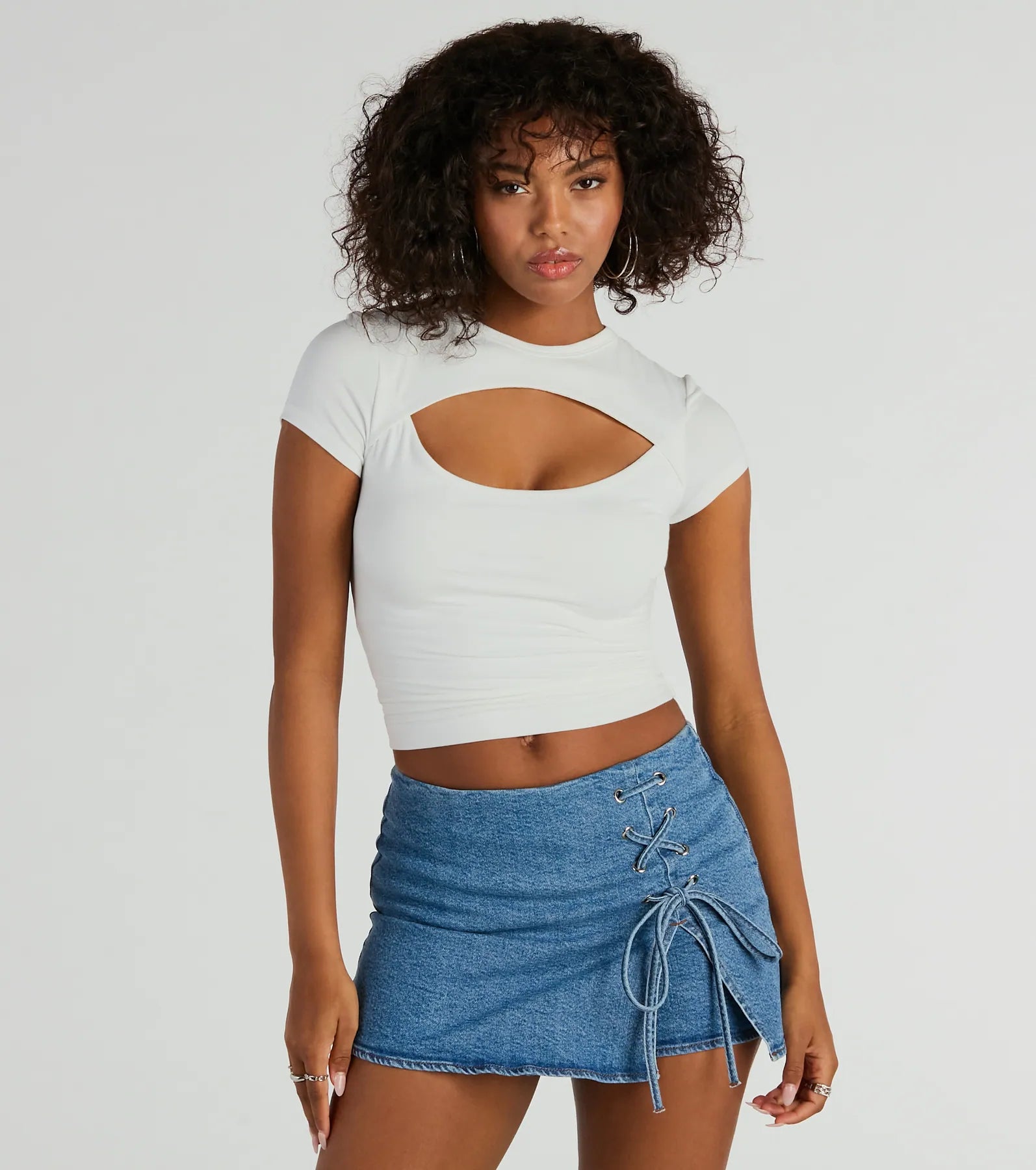 A coveted summer style starts with this mid-rise denim skort perfect for casual plans! Made from denim fabric. this skort is perfect for showing off your legs in a flirty mini-length hem. Its mid-rise waist and form-hugging fit will accentuate your curves. while the playful skirt overlay with lace-up detailing and a slit adds a touch of edginess. Complete the look in a flirty crop top and sneakers.