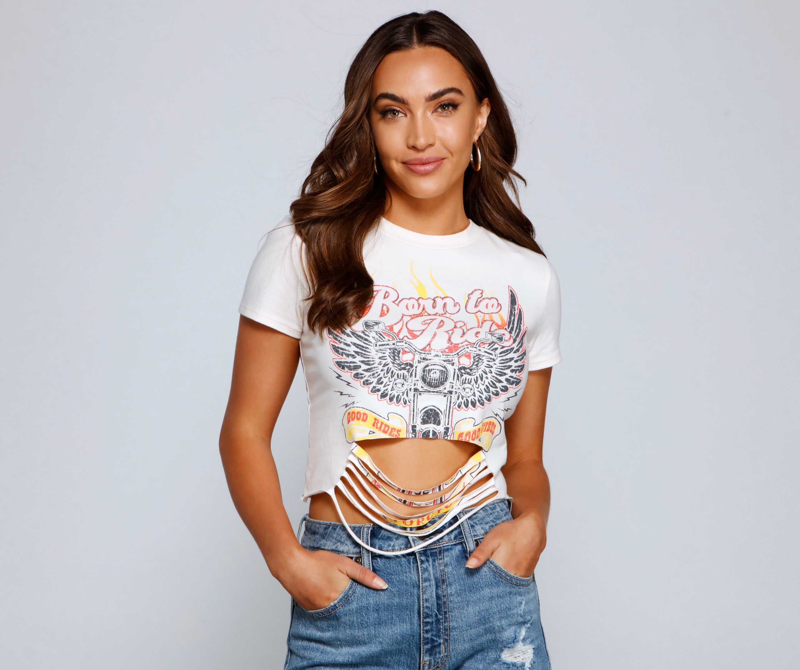 Show off your adventurous side with a graphic tee that says it all! The tee features a crew neckline. short sleeves. a graphic that reads: "Born to Ride". an image of eagle wings with a motorcycle. slashed detailing. and a cropped hem. Complete look with high waist shorts and combat boots.