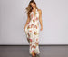 Elegantly subdued hues and sophisticated cut lend this maxi its easy appeal. Dress features a halter neck with deep V. banded waist with cutout and two rows of braid trim. a braided clasp back. and an A-line skirt with back zip. Dress is partially lined and made from a soft. crepe-like woven material with little to no stretch.