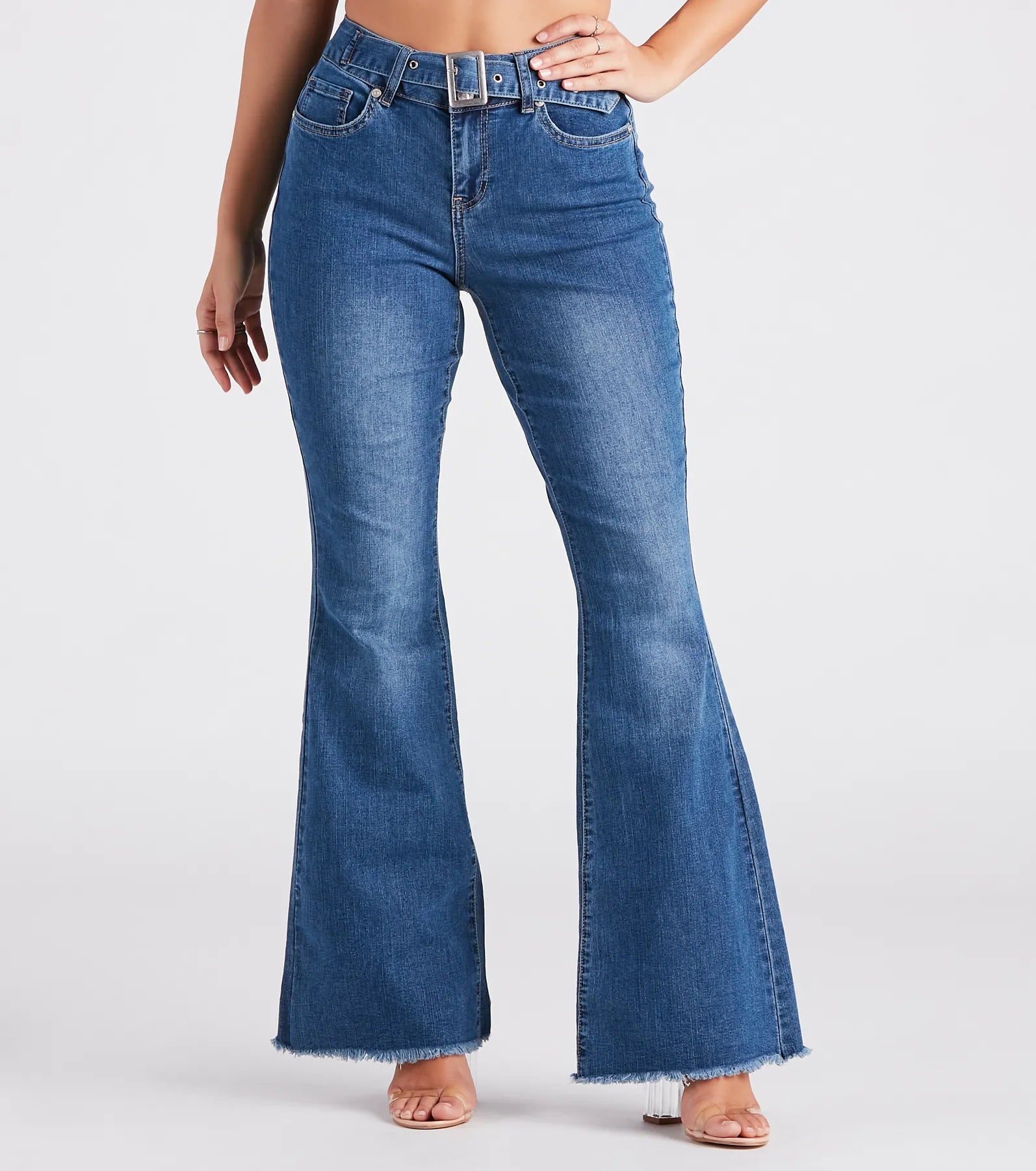 Fling into the Bri flare jeans by Windsor Denim! They feature a flattering mid-rise waist with an adjustable belt and buckle closure. a hip-hugging fit. and a raw flared hem. The jeans are composed of premium medium-wash denim fabric with a color fade effect and minimal stretch. Complete the look in a corset top for a casual dinner out!