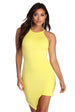 Brighten up the day with this pretty yellow mini dress! It features a sleeveless bodice. halter straps with a racer back with a keyhole cut out and a back button closure. seam detailing. and a short. asymmetrical hem. The dress is composed of a crepe fabric that offers moderate stretch.