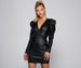 Bring the drama in a bodycon that creates a head-turning moment! The dress features a plunging V-neckline. long puff sleeves. a cinching belted waist. and a mini-length silhouette. The dress is composed of a curve-hugging faux leather fabric that offers a moderate stretch. Complete look with clear mules.Â