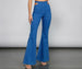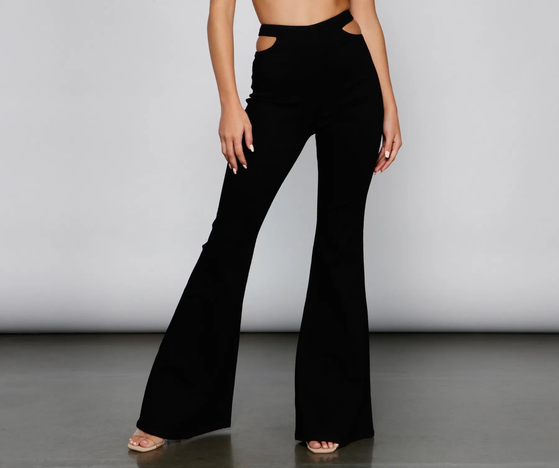 Bring the flare with jeans that channel those retro vibes! These jeans feature a high-rise waist with cutouts on each side. a straight-leg fit. and a trendy flared hem. The denim fabric offers a form-hugging fit with a moderate stretch. Complete the look with a bustier and mules.