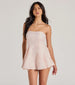 You'll always bring the glamour with this strapless skater romper at any event! Crafted from a jacquard woven fabric. this luxe romper offers a dressy look. It features a strapless neckline. padded bra cups for support. and a flirty and flattering skater silhouette with shorts lining. Complete the look with stiletto heels.