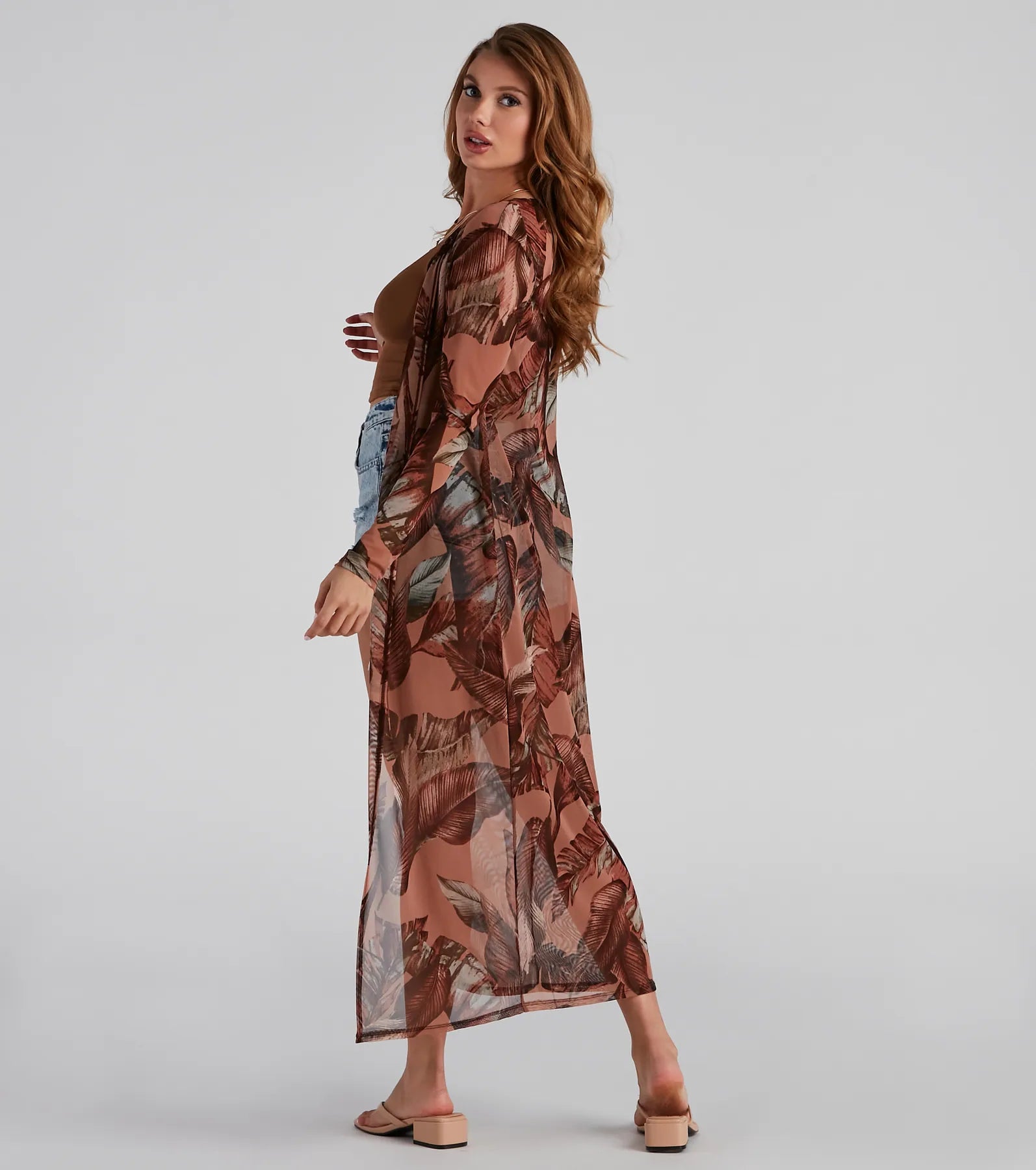 Bring the heat to your vacay look in this tropical mesh duster featuring long sleeves and an open-front design. Complete the look in the matching top and bottoms.