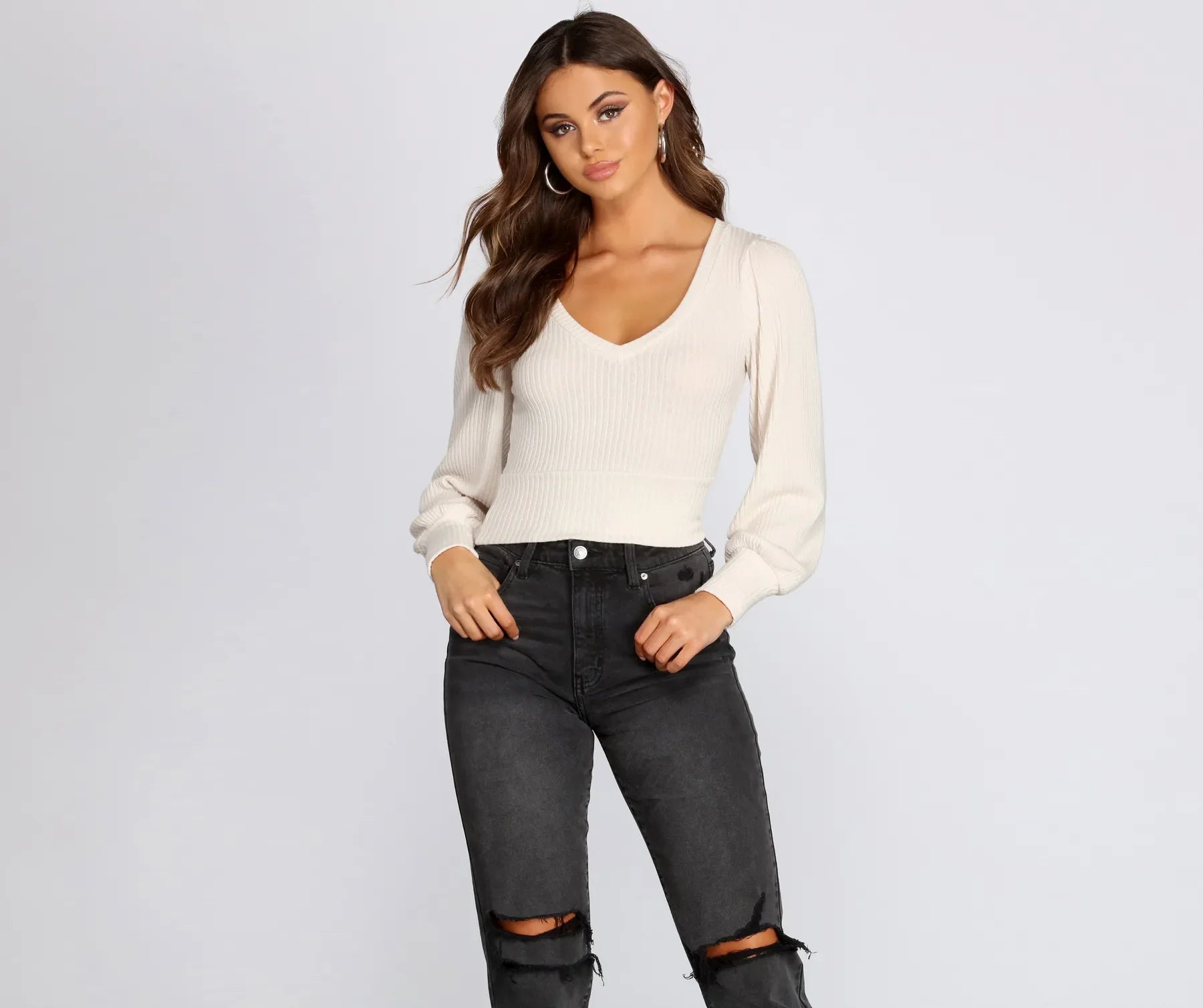 You always need a comfy knit in your wardrobe! This top features a V neckline. long semi-loose sleeves with banded cuffs. and a wide banded cropped hem. The ribbed knit fabric offers plenty of stretch and a form hugging fit.