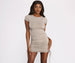 Keep it casual in a knit mini dress. The dress features a round neckline. short sleeves. ruched side seams with bungee straps and a mini length silhouette. The dress is composed of a smooth knit fabric that offers a form hugging fit with a moderate stretch. Complete look with hoops and heels to dress up this casual dress.Â