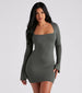 This ribbed knit mini dress will create perfect casual 'fits! It features a square neckline. long fitted bell sleeves with cute flared-out hems. and a mini-length. form-hugging silhouette. The lined knit fabric offers plenty of stretch for comfortable wear. Style with knee-high boots.