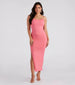 Stroll outside looking casually cool and cute in this basic maxi dress design with a sleeveless scoop neck with bungee spaghetti straps. a form-hugging silhouette. and a high-cut side slit. Complete the look in a crop denim jacket and sneakers.