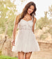 The romance of the Cathy lace short dress is in the air this season! Showcasing flirty tie straps. a corset bodice. and a delicate ruffled A-line silhouette. this dress will have eyes on you.