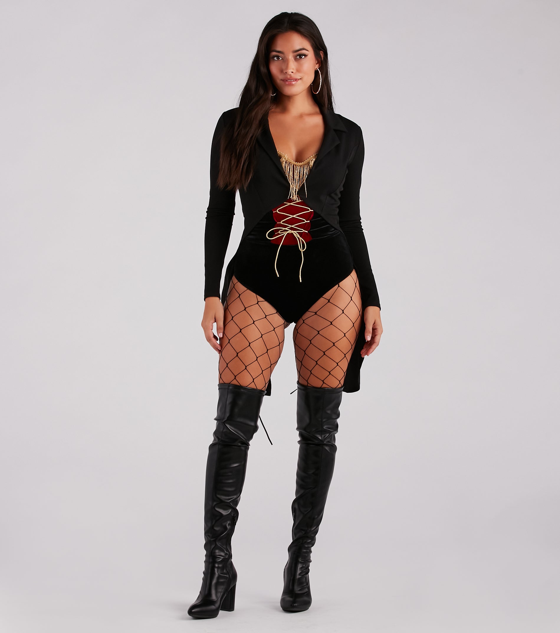 All eyes are on you in the center of the ring as a sultry ringleader! Layer on this crepe high-low jacket featuring fitted long sleeves. a lapel collar neckline. an open front design. and a center back slit. Complete your look with a bodysuit. shorts. and bold thigh-high boots for a party!