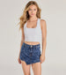 Take center stage in this acid denim skort to rock out at concerts or festivals! Made from a denim fabric with an edgy acid wash rinse. this skort features a flattering high-rise waist. a front envelope skirt overlay for added flair. and a form-hugging mini silhouette. Complete the look in a cute strapless top and boots.