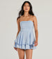 They'll be oh-so-charmed by you in this flirty ruffled woven skater romper! Designed with a breezy woven fabric. it features a strapless straight-across neckline. flexible boning at the bodice for added structure. a tie-back design for a stylishly cinched waist. an adorable short ruffled overlay over flowy shorts. and a fit-and-flare silhouette. Complete your look with hoop earrings and sneakers for a cute and casual vibe.