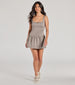 A sleeveless plaid romper features a square neckline adorned with a velvet bow and a flattering form-hugging fit that leads to the flared short-length hem. Perfect for back-to-school styling.