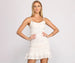 Charm in a floral dress that brings the gorge factor for your next brunch date. The dress features a sweetheart neckline with ruffled trim. adjustable spaghetti straps. a ditsy floral print. and a mini length silhouette with a multi-tiered ruffled detail. Complete your charming outfit with wedge heels and a sleek bracelet.Â