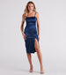 Make your next cocktail party a chic affair with this sleek satin midi dress. It features a sleeveless square neckline. spaghetti straps. an alluring open back with a bar strap accent. a lower back ruched knot detail. a midi-length hem with a high front slit. and a form-hugging silhouette. The satin-knit fabric offers a moderate stretch. Complete your look with rhinestone heels.