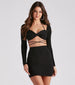 Allure them all with your chic and sultry style in this daring mini dress! It features a sweetheart neckline with a twist-front design. halter spaghetti straps. long fitted sleeves. a bold front waist cutout with a criss-cross strappy design. a mini-length skirt with a high-rise fit. and a curve-hugging bodycon silhouette. The double-lined knit fabric offers a moderate stretch. Complete your night out look with sleek hoop earrings and clear heels.