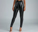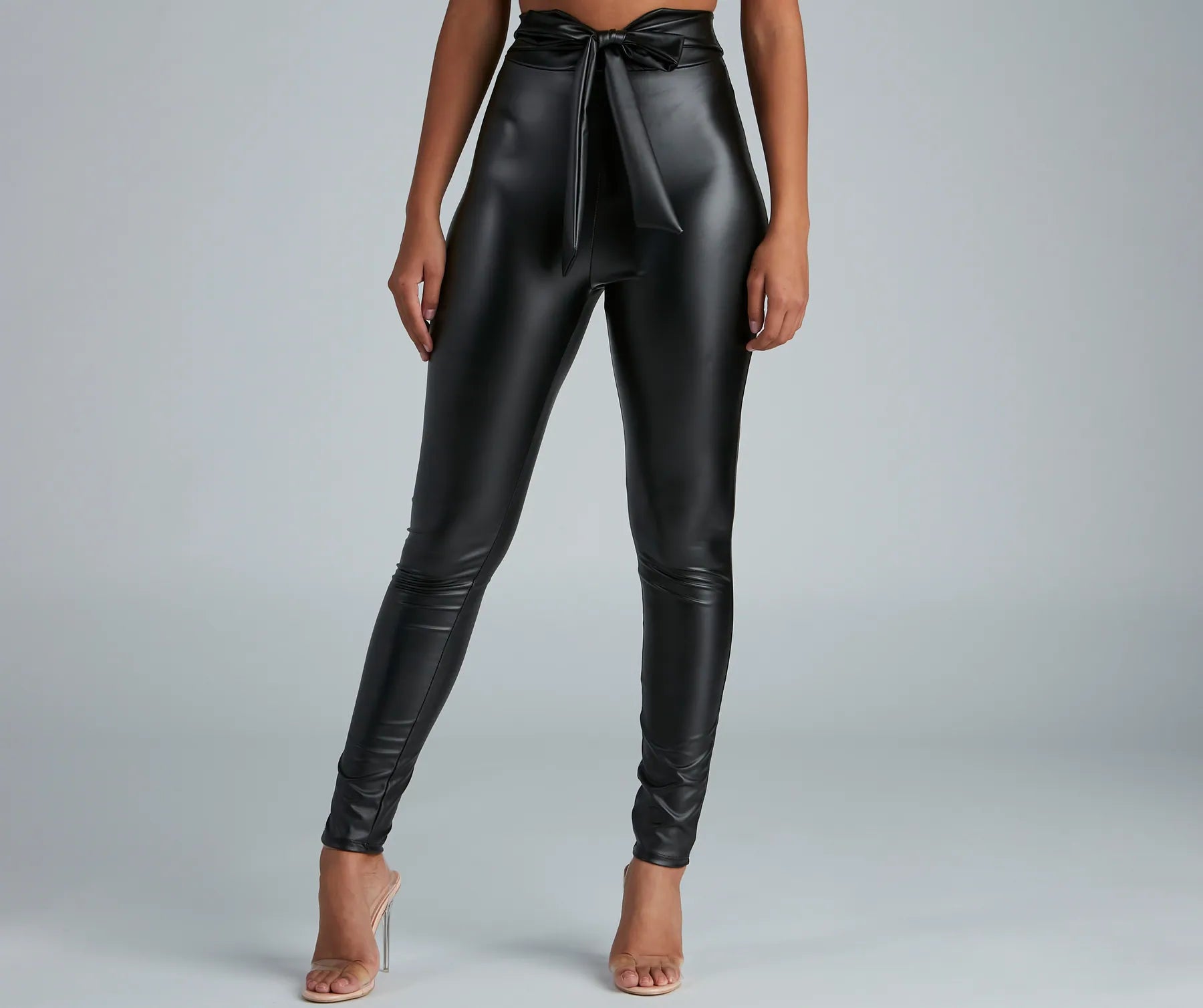 Showcase chic dressy vibes in these on-trend faux leather pants. They feature a high-rise waist with a cross-over V-shaped front design. a tie-front detail. skinny pant legs. and a form-hugging fit. Style these pants with a cute blouse and clear heels.