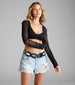 Layer on chic style with this airy sheer mesh bolero with long fitted sleeves with a trendy ruched design.