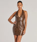 The faux leather mini dress features a plunging V-neckline with halter straps leading to an open back for a sultry allure. The chic corset bodice will snatch your waist. accented with a cutout lattice front. and the bodycon silhouette will flaunt your gorgeous curves.